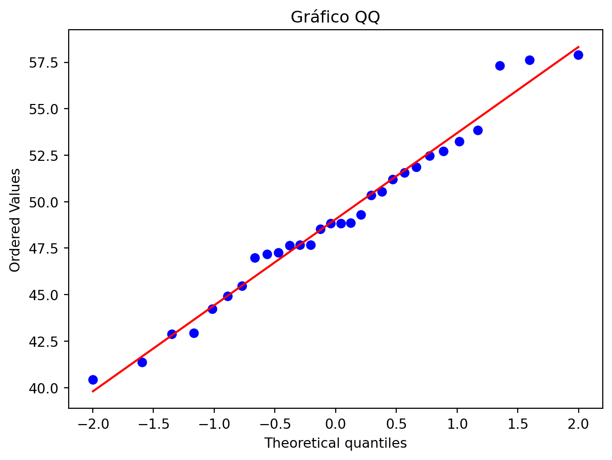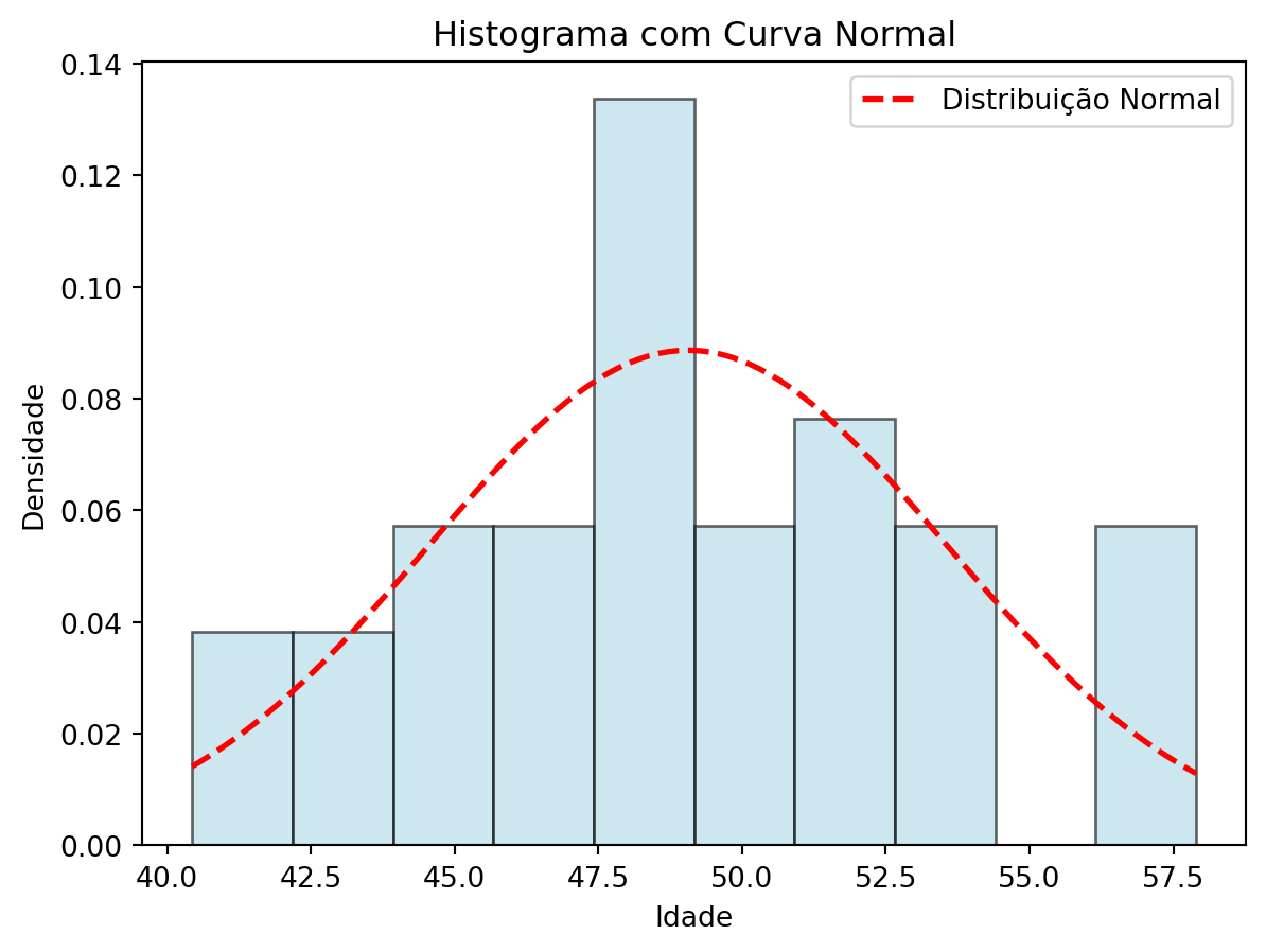 import numpy as npimport matplotlib.pyplot as pltfrom scipy.stats import norm, probplot# Gerando os dados simuladosnp.random.seed(42)dados = np.random.normal(loc=50, scale=5, size=30)# Informações da amostramedia = np.mean(dados)desvio_padrao = np.std(dados, ddof=1)# Criar o histograma normalizadocount, bins, ignored = plt.hist(dados, bins=10, density=True, alpha=0.6, edgecolor='black', color='lightblue')# Plotar a curva normal teóricax = np.linspace(min(bins), max(bins), 100)plt.plot(x, norm.pdf(x, media, desvio_padrao), 'r--', linewidth=2, label='Distribuição Normal')# Estética do gráficoplt.title('Histograma com Curva Normal')plt.xlabel('Idade')plt.ylabel('Densidade')plt.legend()plt.show()# Gráfico QQprobplot(dados, dist='norm', plot=plt)plt.title('Gráfico QQ')plt.show()