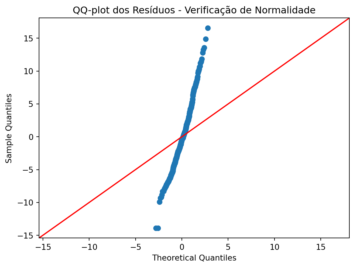 | 4. Normalidade | Resíduos seguem distribuição normal | Histogramas, QQ-plots, teste de Shapiro-Wilk |